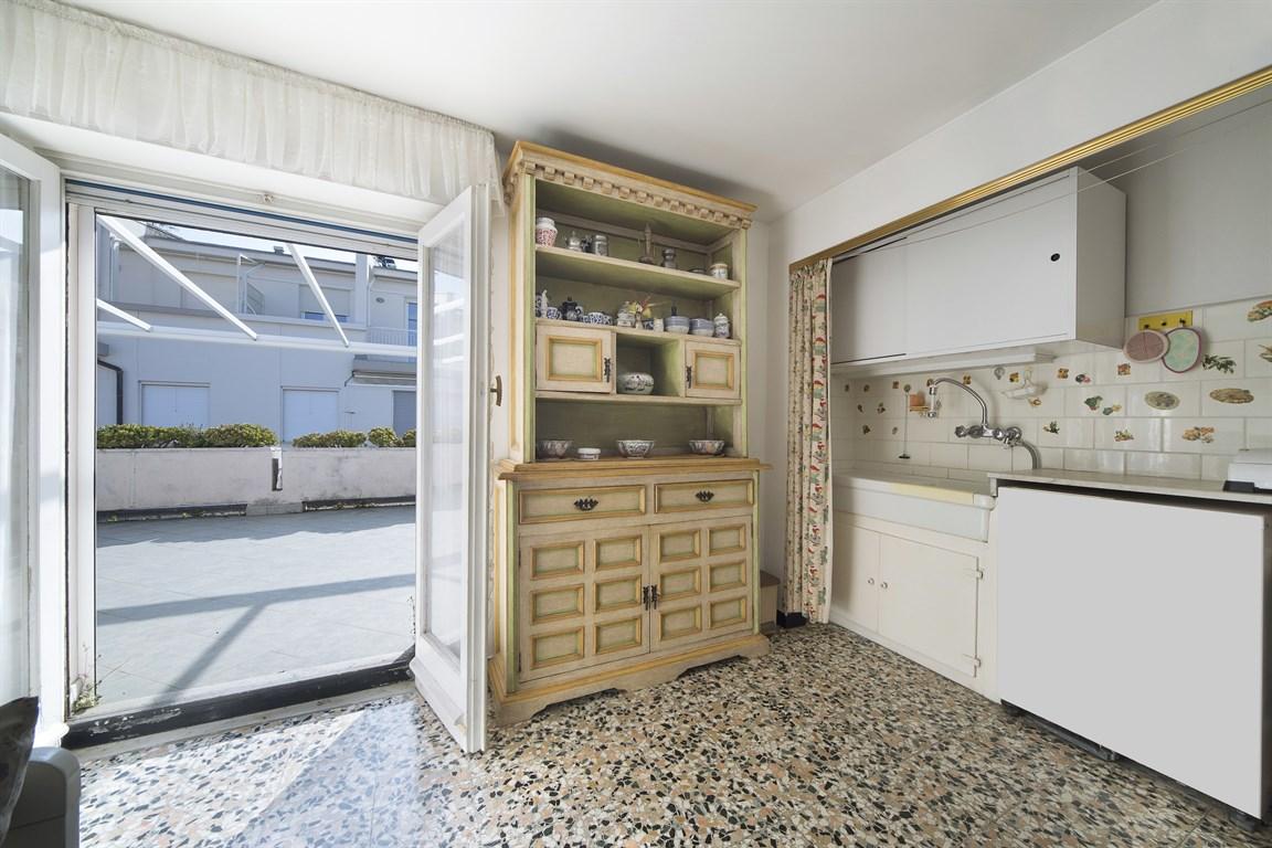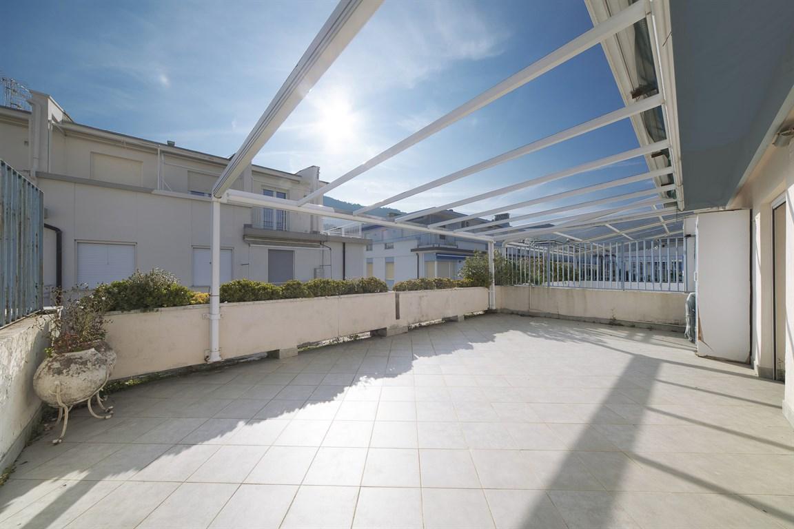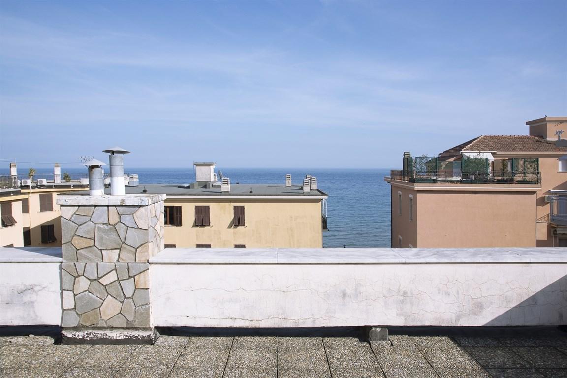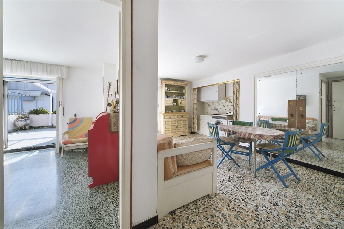 Alassio, 50 metri dal mare attico, con terrazzo di 20 mq., vista laterale mare, quarto ed ultimo piano di una palazzina dotata di ascensore, ma al quale, il proprietario attuale, non ha aderito nella spesa di istallazione, ma volendo in qualsiasi momento vi é la possibilità di aderirvi, versando la quota stabilita da delibera condominiale. l'appartamento é composto da ingresso, soggiorno con angolo cottura e ampia dispensa, due camere da letto, un bagno con finestra e esposto a sud ampio terrazzo antistante. l'attico é totalmente da ristrutturare, riscaldamento autonomo a gas.